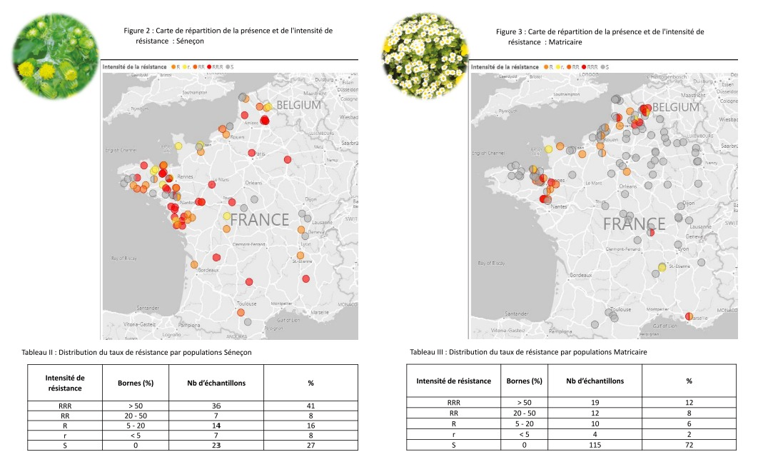 Corteva agriscience développe depuis 2016 le réseau ORIZON, qui a pour objectif de suivre les résistances au champ concernant les herbicides inhibiteurs de l’AcétoLactate Synthase (ALS-i) sur les espèces d’intérêt comme le coquelicot, la matricaire camomille, le séneçon commun. Depuis 2016, 8 350 individus de matricaire camomille et 4 900 individus de séneçon commun ont pu être analysés et rassemblés dans ces cartes. Ce suivi permet notamment de réfléchir à la gestion du désherbage à long terme, dans le but de préserver des solutions efficaces, avec différents modes d’actions, car la gestion de ces adventices demeure essentielle en céréales.