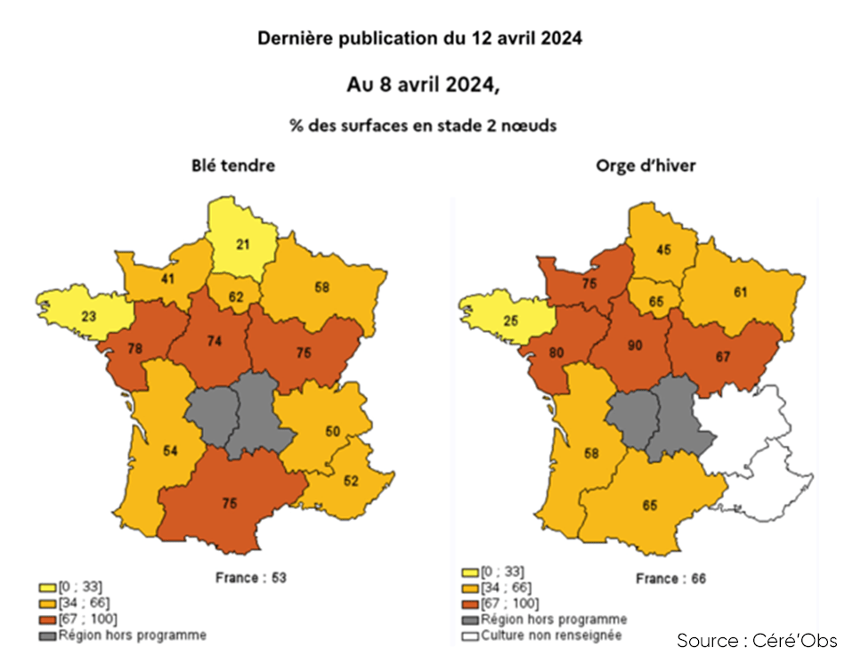À la mi-avril, à l’échelle nationale, les blés sont en avance de près d’une semaine par rapport à 2023 à l’exception des régions Grand-Est, Bourgogne Franche-Comté et Ile-de-France. Le risque Septoriose est important, partout où les parcelles sont au stade deux-nœuds (cf. cartes ci-dessous). Le risque rouilles est aussi à prendre en compte en fonction des régions.