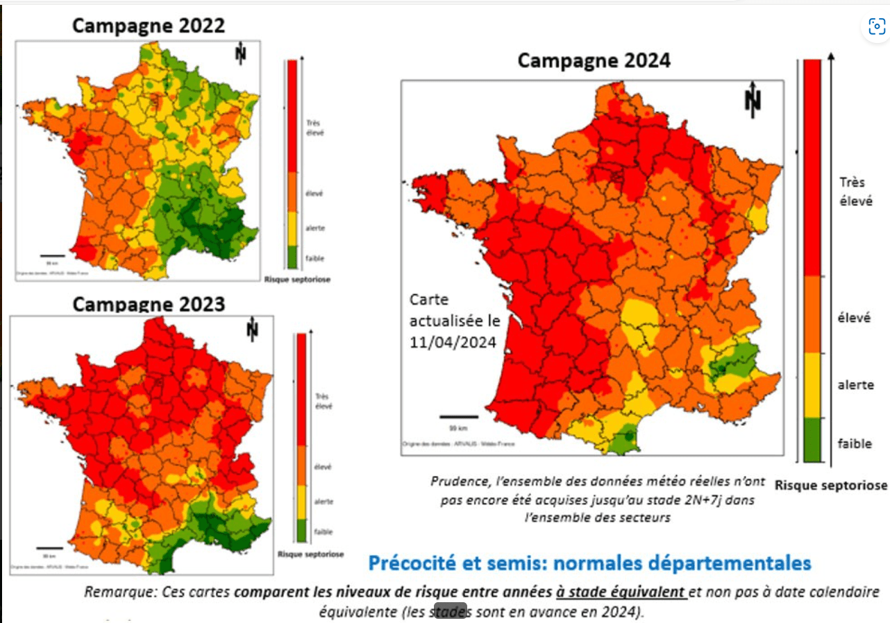Les conditions climatiques humides et chaudes restent très favorables à l’évolution de la septoriose. La comparaison avec les dernières campagnes montre la forte pression de la maladie.