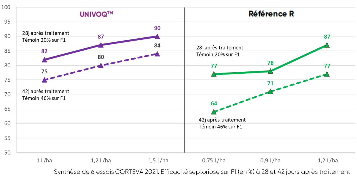 Au vu des stades très précoces cette année et du risque maladie important, une augmentation de la dose d’utilisation des solutions à base d’INATREQ active peut s’avérer utile pour assurer une persistance suffisante jusqu’à début floraison. La persistance d’action d’Inatreq active est fonction de la dose. Pour une application à dernière feuille pointante (DFP) de 60 g/ha d’Inatreq active par exemple, il a été démontré une persistance d’action de 6-7 semaines (cf. graphique ci-dessous).