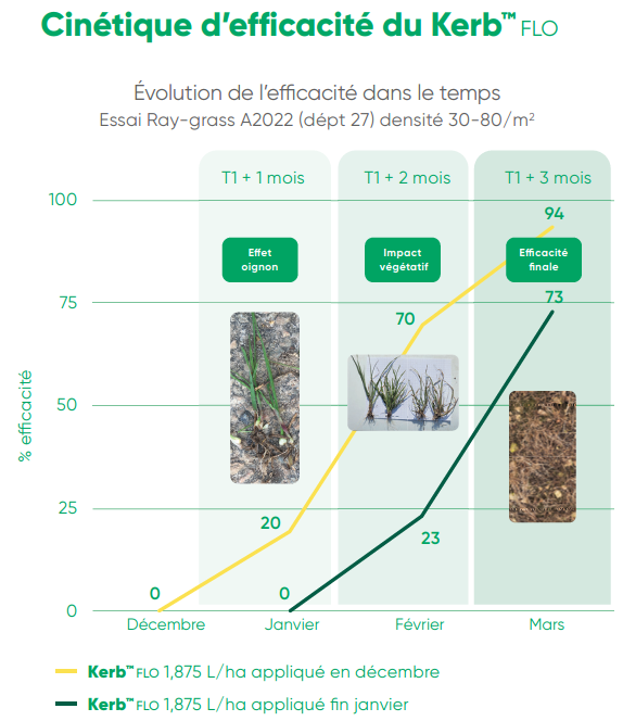 Si Kerb Flo/Odin, Ielo/Yago/Biwix bloquent rapidement la croissance des graminées, les symptômes de destruction peuvent mettre du temps à apparaître. Ils surviennent généralement à partir de la reprise de végétation, fin février/début mars. La patience est de mise, il ne faut en aucun cas renouveler l'application.