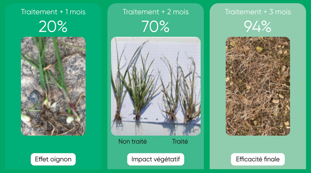 Bien que le propyzamide bloque rapidement la croissance des graminées, les signes visibles de leur destruction peuvent se manifester plus tard, généralement à partir de la reprise de végétation, entre fin février et début mars.