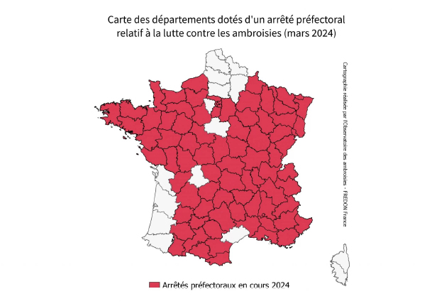 Depuis 2017, la réglementation nationale vise trois espèces d'ambroisie : à feuilles d’armoise, trifide et à épis lisses. Voici la carte des départements soumis à arrêté préfectoral relatif à la lutte contre les ambroisies :
