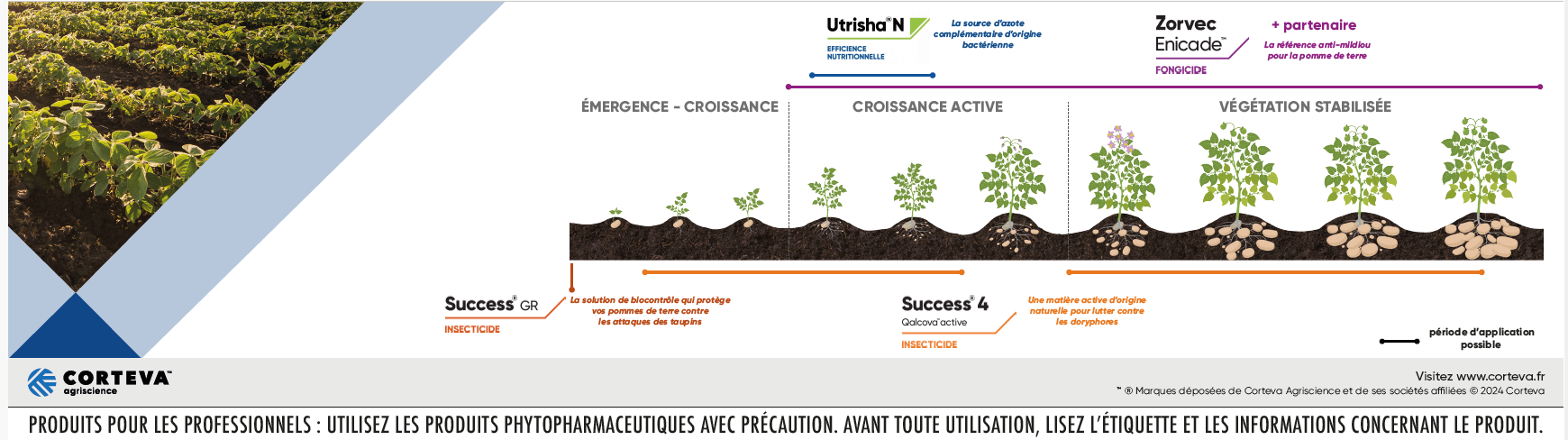 Corteva propose une solution pour chaque étape de développement. Dès l’implantation, avec Success® GR, à la végétation stabilisée, avec le fongicide Zorvec™ active, en passant par la croissance active, avec Success® 4 et Utrisha® N, l’efficacité et la complémentarité des solutions font de Corteva un partenaire fidèle et robuste pour la culture de pomme de terre.