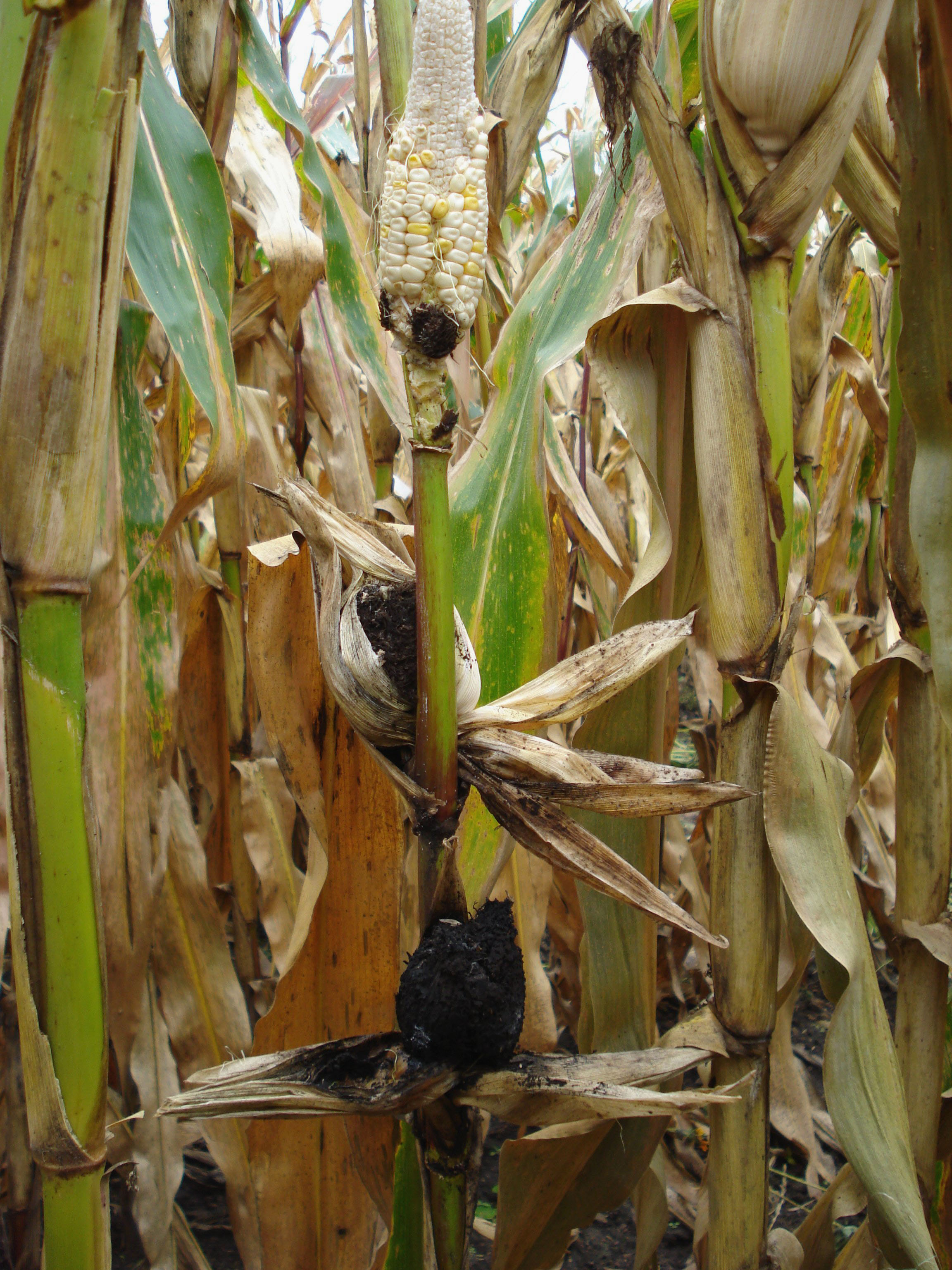 Deux types de charbon peuvent affecter le maïs : le charbon commun, dû à Ustilago maydis (ou Ustilago zeae), et le charbon de tête, provoqué par Sphacelotheca reiliana. Ces champignons pathogènes peuvent infecter tous les organes de la plante (feuilles, tige, épi) en pénétrant par des plaies, notamment celles causées par la grêle, les fortes pluies ou encore certains herbicides. Ils forment alors des excroissances caractéristiques appelées « galettes de charbon », remplies d’une poudre noire composée de spores.