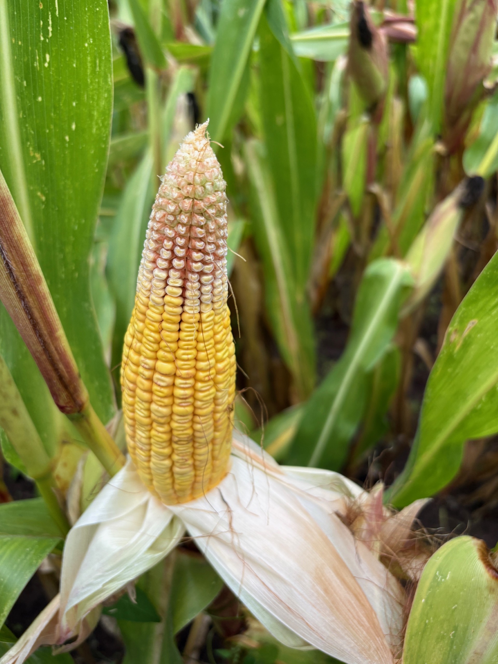 Avec un déficit de pluie d’environ 30 % en juin et des sols durablement secs, les maïs ont souffert d’un stress hydrique marqué. Le gabarit moyen s’en ressent : des plantes plus courtes, mais avec un rapport épi/plante plus élevé. Selon les zones, la floraison s’est déroulée soit pendant la canicule de fin juin, soit entre les deux épisodes caniculaires, avec des conséquences très variables.