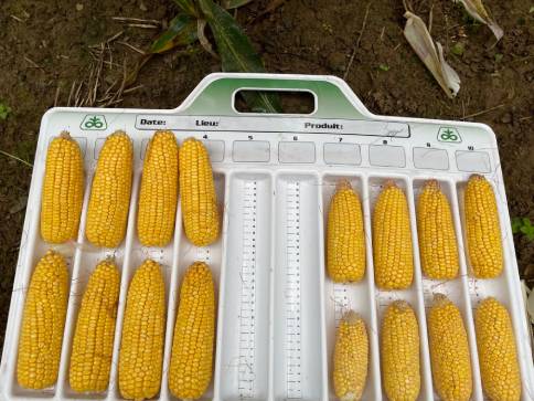 Pour preuve cette photo, issue d'un essai agronomique Pioneer à Martigné-Ferchaud (Ille-et-Vilaine) où un même hybride a été semé à 4 densités différentes : 75 000 pied/hectares (en bas à gauche), 90 000 (en haut à gauche), 105 000 (en haut à droite) et 120 000 (en bas à droite). Photo prise le 25 septembre 2024.