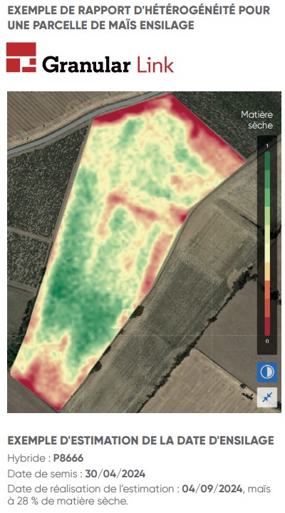 Ce service propose depuis un an un module d’estimation de la date d’ensilage du maïs. Basé sur un modèle de prédiction innovant, Granular Link intègre l'analyse de l’indice de végétation, les prévisions météorologiques et la croissance du maïs pour fournir une estimation de la date de récolte à partir de la floraison (soit six semaines avant récolte), avec une réactualisation fréquente.