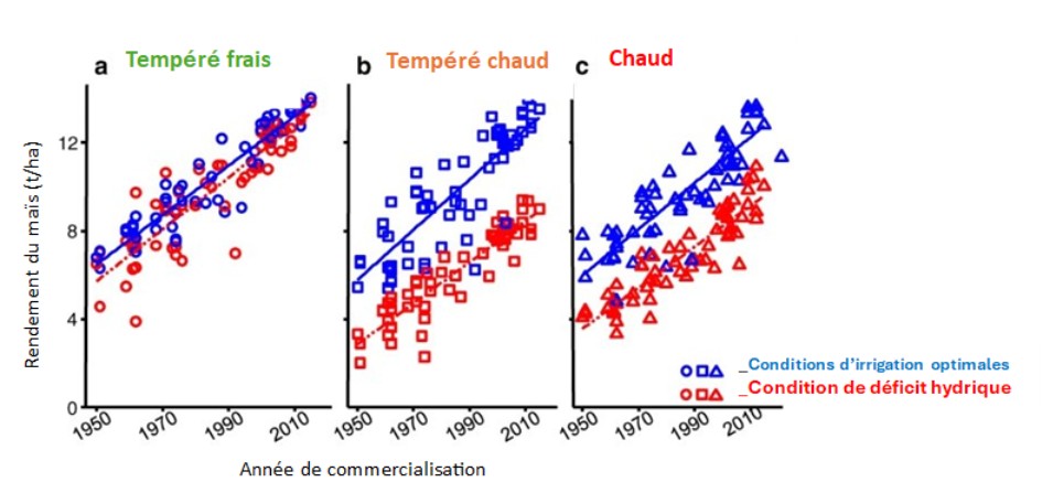 Face au changement climatique, l’amélioration du comportement des plantes est essentielle pour soutenir les rendements agricoles. Les progrès de la sélection génétique en maïs grain ont permis d’éviter jusqu’à 20 % de perte de rendement du maïs grain en France entre 2000 et 2019. (Source : Les valeurs socio-économiques et environnementales de la sélection végétale dans l’UE_HFFA) Une étude européenne menée par l’INRAE a comparé la performance dans différents environnements des 66 hybrides de maïs les plus vendus entre 1950 et 2015. Les résultats montrent une augmentation continue des rendements permis par les différentes générations de variétés, quel que soit l’environnement climatique (Tempéré frais-Tempéré chaud-Chaud). Ces résultats démontrent également que le progrès génétique est similaire en bonnes situations irriguées et en situation de déficit hydrique.