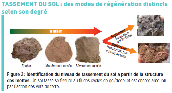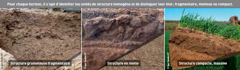 L’observation des horizons complète ensuite l’analyse : sont-ils fragmentés (avec une forte porosité), motteux (alternance de mottes et de vides) ou compactés (sans motte ou agrégat visible) ?