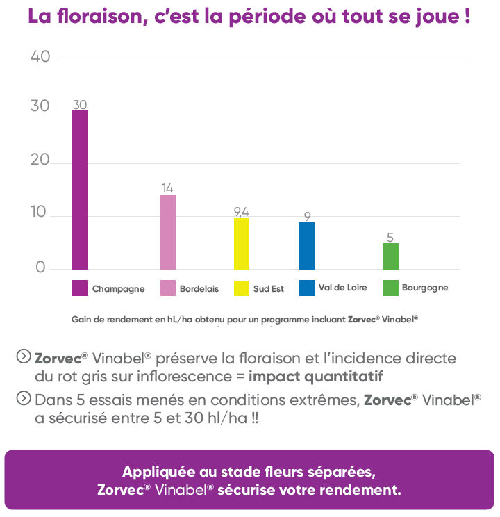 L’avis de l’expert Geoffrey Hamain – Responsable technique national Vigne « Choisir Zorvec® Vinabel® dès le début de la floraison, c’est investir au bon moment dans LA solution incontournable sécurisant votre vendange. En effet, c’est à ce stade que tout se joue.