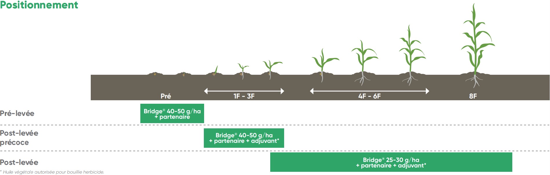 Souplesse d’application : Postionnement autorisé en prélevée et post-levée (de BBCH 00 à 18)