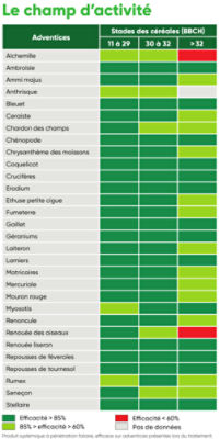 | Seigle de printemps | Dicotylédones | 1 L/HA | 1 /an | 13 | 45 | DAR F | 5 |