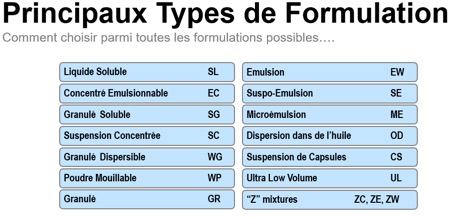 De nombreuses formulations sont aujourd’hui utilisées pour l’élaboration des produits phytosanitaires, avec chacune, ses avantages et ses inconvénients. Si historiquement, les premiers produits se présentaient sous la forme de poudre mouillable (WP), on a ensuite vu apparaître les formulations liquides, plus faciles à mesurer et plus pratiques à utiliser. Elles ont été déclinées progressivement en différents types de formulations. Des formulations solides, plus faciles à utiliser que les poudres, ont aussi été mises au point.