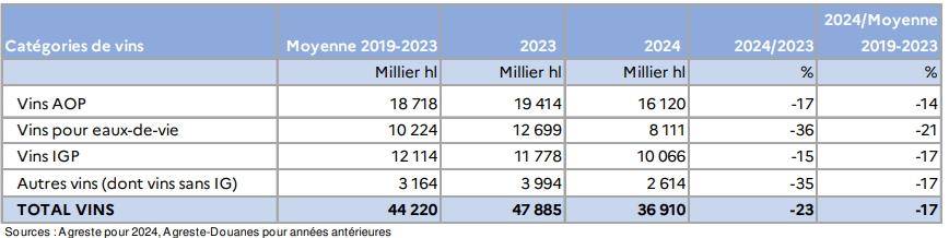 Dans cette région, la réduction des surfaces viticoles, combinée à la coulure, au millerandage, au mildiou et à des épisodes de grêle, entraîne une nouvelle baisse de 12 %, après un recul déjà enregistré en 2023.